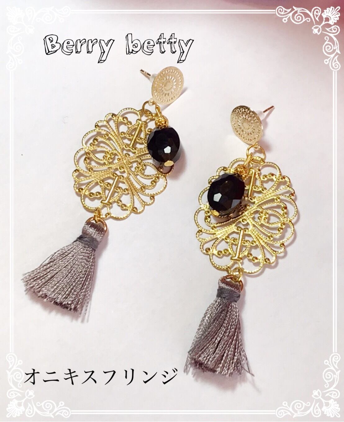 追加★魔除け厄除けオニキスのフリンジピアス★ゴールドチャーム