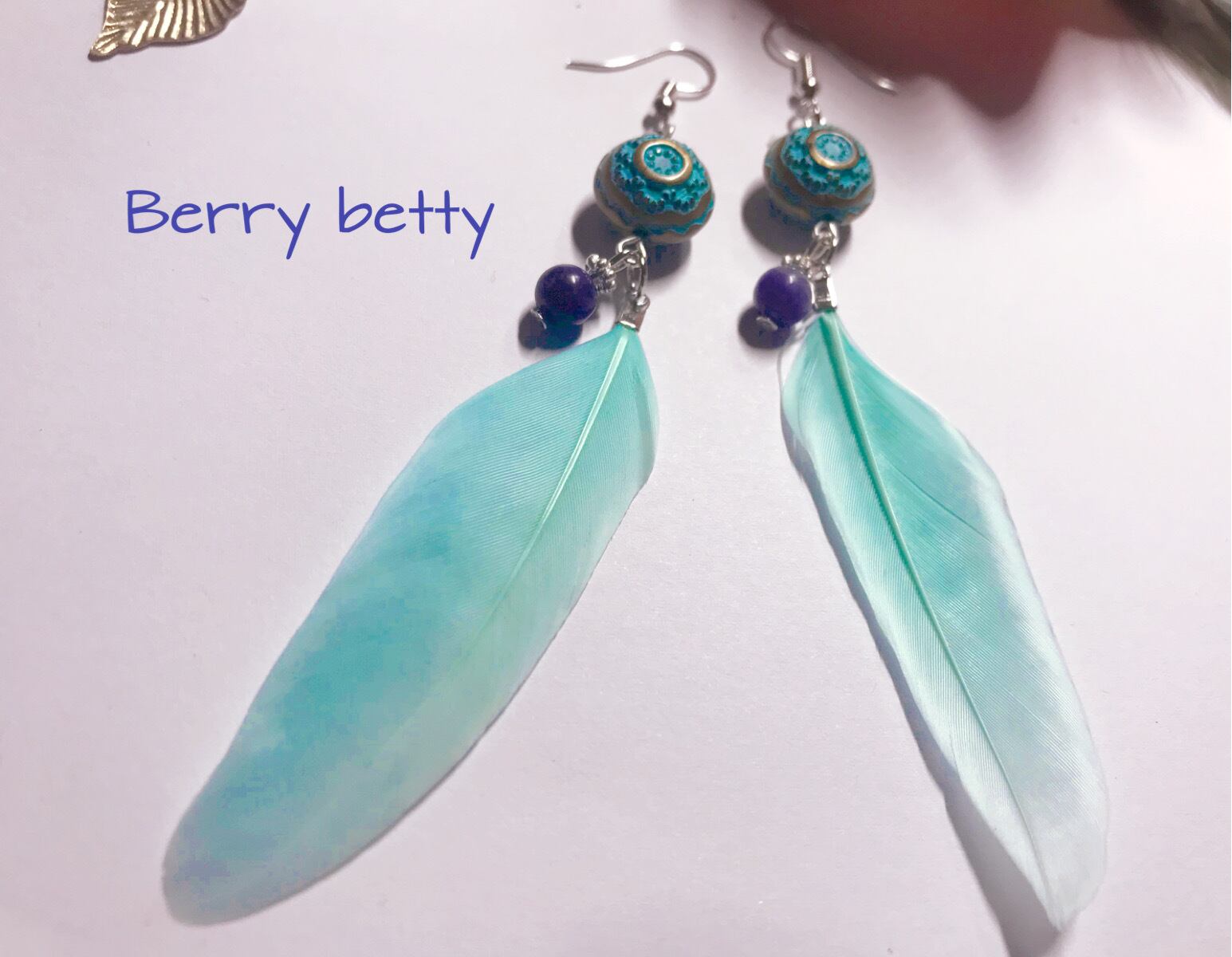 天然石ソーダライトが揺れるターコイズ風羽ピアス